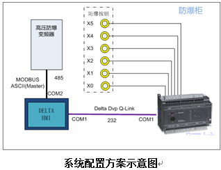 该系统主要配置包括ES2R控制器 1 台,B05S100触摸屏1台,高压防爆变频器1台,6枚按钮防爆。整个系统中,除6枚防爆按钮安装在防爆柜面板外,其余部分都封闭于防爆柜体内,变频器所有操作通过6枚按钮完成。因为处于防爆环境中,不能直接操作接触摸屏,所以要通过PLC的6个输入点外接防爆按钮来代替在触摸屏上的操作。该方案的灵活之处就是避免了操作人员直接触摸屏,从而防止事故发生。