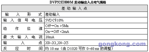 DVP32EH00M之X0~X1及X4~X5均为DC5V高速输入电路(其余为DC24V输入)。此高速输入电路工作频率可达200kHz,主要是用以连接差动(双线式) LINE DRIVER输出电路用,也可使用单端之DC5V SINK/SOURCE输入,或将之变成单端之DC24V SINK/SOURCE输入,这也解决了某些特殊传感器低电压(DC5V)时无法由PLC采集其状态的问题。