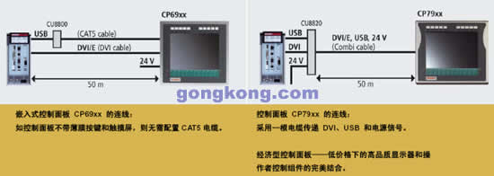 满足全方位要求的控制面板 该系列嵌入式“经济型”面板的前部防护等级可达IP65,更有三种型号的产品满足了绝大部分的应用场合: | CP62xx | 提供Pentium® M 性能的强大面板型PC,非常适用于单机运行方案。 | CP66xx | 带有266 MHz XScale 处理器的以太网控制面板,能通过两个10/100 M 以太网接口来连接。该控制面板非常适合作为一台独立的PC或当作终端客户机来使用。 | CP69xx | 采用DVI/USB扩展连接的控制面板,适合用于机械设备和系统工程应用的纯显示设备。 CP69xx的DVI/USB拓展连接是一个革命性创新:它能够使显示设备安装到50m远的标准距离。DVI设备的最远传输距离是5m,而Beckhoff的CP-Link能够使这个范围扩展到100m。显然,面板的应用正趋向使用标准技术,例如使用DVI(用来影像传输)和USB(用来传递触摸信号)。在德国汉诺威展会上,Beckhoff展示了集成了DVI和USB,采用单根电缆连接方案的控制面板CP7xxx。在这根电缆上甚至包含了给CP7xxx控制面板的电源信号。