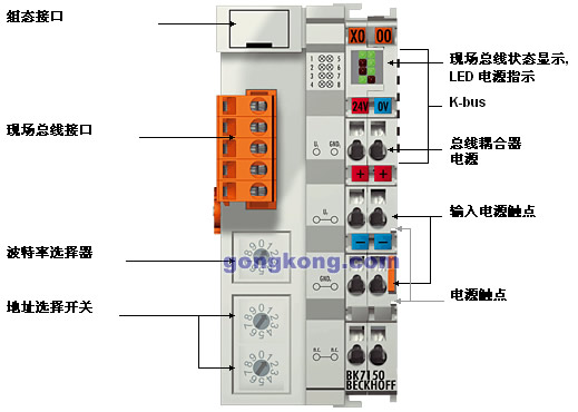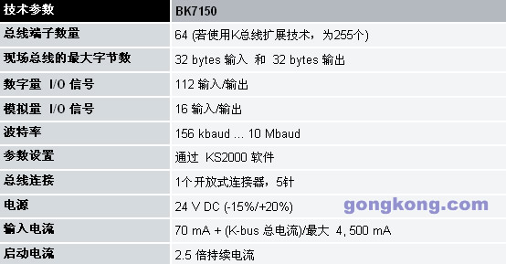 CC-Link 是一个开放式的现场总线系统,波特率为最大为10 Mbaud,能通过开关选择,这样,根据技术进程的需要可切换采用不同的速度。 对模拟量 I/O、位置测量等复杂信号的处理 BK7150 总线耦合器可连接所有的总线端子。只要用户将它们连接起来,处理模拟量 I/O 信号与处理其它种类的信号没有什么区别。控制器过程映像区内的信息以字节队列的格式出现,等待控制器作下一步处理。 在每一个具体应用中,模拟量总线端子和多功能总线端子都可以通过 KS2000 组态软件进行配置。根据不同型号,模拟量总线端子寄存器中存有温度范围、增益和线性参数。使用 KS2000 软件,可以在 PC 机上设置所需参数。总线端子可以永久存储方式和发生故障时的安全存储方式保存参数设置。 当然,总线耦合器也可以由控制系统来控制。在 PLC 或 IPC 的调试阶段,使用功能块(FB)即可对整个 I/O 进行配置。如果需要,控制器可以上载分布式产生的组态数据,以便于集中管理和存储这些数据。因此,当更换一个总线耦合器时,不需要重新调整。
