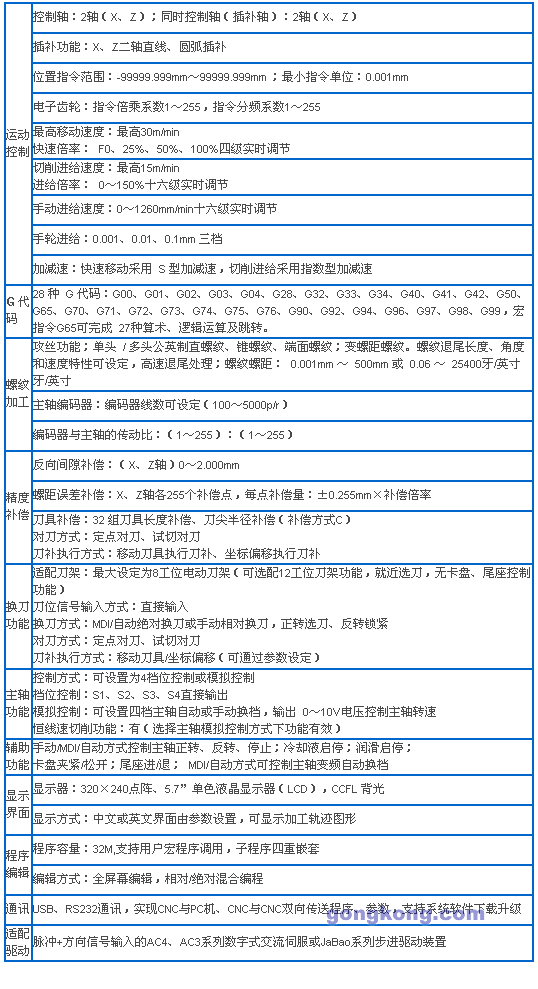 ·采用32位高性能CPU和超大规模可编程器件FPGA,运用实时多任务控制技术和硬件插补技术,实现μm级精度运动控制更强大的宏功能,增加浮点数宏功能。 ·X、Z二轴联动、μm级插补精度,最高速度16m/min(可选配30m/min) ·可实现各种自动刀架、主轴自动换档等控制,I/O口可扩展(选配功能) ·具有攻丝功能,可车削公英制单头/多头直螺纹、锥螺纹、端面螺纹,螺纹退尾长度、角度和速度特性可设定,高速退尾处理 ·USB和RS232通讯方式,支持CNC与PC,系统软件可通讯升级,方便用户的生产管理 ·提供多级操作密码功能,方便设备管理 ·具有螺距误差补偿、刀尖半径补偿、反向间隙补偿功能 ·具有S型、指数型加减速控制功能,适应高速、高精加工 ·32M超大存储空间,满足用户大存储要求 ·安装尺寸、电气接口、指令系统、操作显示界面与国内通用系统兼容 功能参数