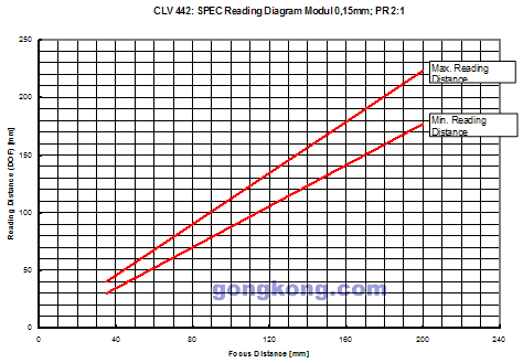 SICK的CAN扫描器网络最多可以连接32台扫描器,再通过主站连接到计算机或其他总线系统。 SICK CAN扫描器网络主要特点 • 不需要增加额外设备即可完成网络连接; • 连接方便,采用一根双绞线电缆即可完成(还需接地线); • 传输距离远,两台扫描器之间距离最远可达1000米以上; • 传输速率高,250米距离时传输速度可达250KBit/S; • 组网方式灵活,多种工作模式可单独或混合使用。 CLV442主要技术参数 • 扫描类型:单线型激光扫描,波长670mm的红色激光,出射平行激光线。 • 阅读距离:30-220mm(0.15mm分辨率条码),30-340mm(0.20mm和0.25mm 分辨率条码)。 • 工作电压:10-30VDC • 输出方式:具有RS232,RS422,RS485标准通讯接口;300-57600bit/s数据传输率;SICK标准,可组建SICK网络,菊花链网络。 • 扫描频率:300-800HZ • 聚焦类型:动态,可实时调节焦距 • 通讯:RS232,RS422,RS485,可组成SICK CAN扫描器网络 • 工作温度:0—40度 • 存贮温度:-20—70度 • 防护等级:IP65(符合DIN40050)/等级3(符合VDE0106/IEC1010-1) • 外形尺寸:90/60/35.7mm • 激光管使用寿命:20,000小时 阅读性能分析图如下: