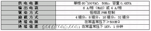 本产品具有以下特点: ★60 ~100V交流供电,适应最恶劣电网环境 ★H桥双极恒相流细分驱动 ★独创的速度自适应电路,自动寻优 ★4、8、16、32四种细分运行模式可选 ★输入信号光电隔离 ★过压保护 ★脱机(FREE)保持功能 ★单脉冲、双脉冲接口可选; ★自动半流; 本产品电气性能如下表所示:  有关本产品的详细介绍如下: 电源电压 驱动器内部的开关电源设计保证了其可以适应较宽的电压范围,一般来说较高的额定电源电压有利于提高电机的高速力矩;但是由于电网的异常波动和系统惯性负载的能量回馈都会使内部电压瞬时升高,当其达到驱动器的过压阈值(180VDC)时就会出现保护现象,频繁的保护会影响用户的正常使用,因此电压的选择不是越高越好。推荐使用80~100VAC。 预设电流 本驱动器通过面板开关可以选择驱动器输出的相电流,4A(第4位为ON)或6A(第4位为OFF)峰值,用户可以根据所选配的电机进行设置,要特别注意避免因选择超过电机额定值的驱动电流所造成的电机和驱动器损坏。需要特殊电流的用户应与厂家联系,由厂家做出调整。当驱动器带电机工作时若连续1秒没有接收到新的脉冲则驱动器自动进入半流状态,电流降低为标准值的50%,达到降低功耗的目的,在收到新的脉冲时驱动器自动退出半流状态。 过压保护 当输入电压超过135VAC时,或者回馈制动导致总线电压超过180VDC时,过压保护电路动作,驱动器报警灯(红色)点亮,驱动器暂停驱动电机,在电压恢复到正常值后可自动解除报警。 单/双脉冲选择 通过面板选择拔码第3位开关可选择单脉冲模式(第3位为OFF)或双脉冲模式(第3位为ON)。单脉冲下步进脉冲由脉冲端口接入,由方向端口的电平高低决定电机的运转方向;双脉冲模式下,驱动器从脉冲端口接收正转脉冲,从方向端口接收反转脉冲;无论是单脉冲还是双脉冲都以光耦导通作为有效信号。 细分选择 用户可以通过驱动器面板上的第1、2两位拨码开关选择4、8、16、32共4种细分模式,细分的设定只在驱动器上电时进行一次,驱动器上电后再改变开关状态被认定为无效,只有重新上电才可按照新选择的细分模式工作。