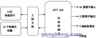 ZM500M 一、特征 ·586级工业电脑 ·640 x 480分辨率 ·全中文9.4寸彩色液晶屏显示 ·最大存储2000个加工文件 ·每款最大孔数8000个 ·加工速度可达800孔/分钟 ·支持手持盒操作 二、系统框图  三、功能描述 ·工控机 电子盘容量:8M -144M 586级工业电脑 ·控制卡 ADT-836(可选) ·显示 9.4寸彩色液晶显示, 640 x 480 ·按键 42个机械式按键 ·手摇编码器 示教编程、手动精确调整 ·急停按扭 软件用于紧急刹车 ·点动按扭 可用于示教点确定等 ·键盘、鼠标接口 方便调试和系统配置等工作 ·通讯口 串口通讯,用于程序下载 ·信号插座 37×2+25×3 (配ADT-836型) ·电源插座 220VAC、配有电源线 ·库函数支持 加减速运动 多轴联动 S形加速 T形加速 连续插补 ·软件编程 DOS:C/C ++语言 Windows:BC++ VC++ ·脉冲输出 4/6路脉冲输出 最高频率:4MHz 脉冲方式:脉冲+方向 脉冲+脉冲 ·I/O通道 → 32/48路数字输入,光耦隔离 隔离电压:2500VDC 输入电压:5-24VDC 高点平:>4.5V 地点平:<1.0V → 32路数字输出 NPN集电集开路 5-40VDC,最大电流100mA 四、订购信息 ADT-WSZM500M五轴植毛/钻孔运动控制器 1台 (内含ADT-836 1块) 配套光盘 1张 使用说明书 1本 ADT-9137 37芯信号电缆接线板 1块 ADT-9125 25芯信号电缆接线板 1块 ADT-D37 37芯信号电缆 1根 ADT-D25 25芯信号电缆 1根 |