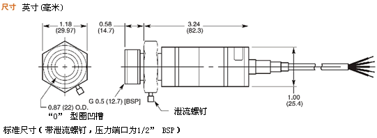 产品特性 . 2线4-20mA输出 . 顺便电压抑制器可防止瞬间高电压 . 内置压力阻尼器 . 1/2" BSP 外螺纹压力端口 . 7/16" - 20 UNF BSP 外螺纹压力端口 . 泄流螺钉可帮助排除系统中的气体 . 压力端口带有O型密封圈槽 . 反向极性保护 . 高过载和破坏压力 . CE 认证 通用标准 压力范围 psi.................. 1500, 2200, 2500, 3500, 5000,7500, 10000 bar ................. 100, 150, 200, 250, 350, 500,700 参考压力........... 密封表压 压力极限................... ≥ 5倍满量程压力或830 bar/12,000 psi(两者取较小值) 破坏压力........ ≥ 20倍满量程压力或22,000psi /1500 bar(两者取小值) 压力介质................. 与17-4pH和17-7pH不锈钢兼容的液体或气体 输入电压....... 10 到36 VDC 零位输出......... 4mA, ±0.3% F.R.O. 满量程输出............ 4 - 20mA (16mA ±0.3%FRO) 负载阻抗(ohms) .............1625 max @ 36V 响应频率......... 100/900Hz 非线性、迟滞和重复性误差......... < ±0.920% F.R.O. 温度漂移(包含零位和满量程输出误差) ..... ±0.008% F.R.O./°F (< ±0.075%FRO/°C) 温度范围 补偿温度................. -4 °F to 176 ° F (-20 °C to 80°C) 工作温度................... -40°F to 212 ° F (-40 °C to 100°C) 储存温度................ -40 °F to 257°F (-40°C to 125°C) 湿度............................ 可浸入性符合IP67国际标准 抗振动............................ 优于Mil Std 810C Method 514-2 Curve L 抗冲击................................. 1000 g/5ms不会损坏传感器 绝缘阻抗....... 500 Mohm @ 50 Vdc 长期稳定性................ < 0.1% FRO/年 EMC ................................... 有CE标记产品,表示在正确安装的情况下,产品符合关于住宅、商业、轻工业和工业环境中EMC的通用标EMC Directive 89/336/EE 注:P981系列本安防爆产品不符合工业环境指令