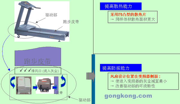 跑步机的使用环境灰尘比较多,因此需要进行防尘处理(皮带在转动时灰尘会进入驱动部分及变频器内部)