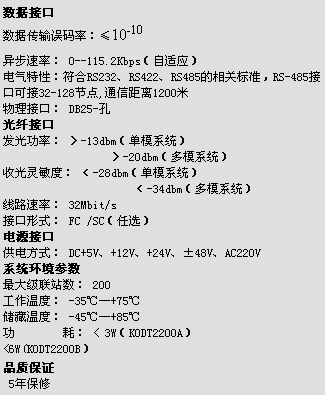 KODT2000系列总线式数据光端机包括KODT2200A、KODT2200B两种。 该产品可组成复杂的通信网络,节省投资资源。应用快速双纤冗余 (<20ms)技术的应用,增强了系统通信的可靠性。并且提供光口告警的遥信量输出接口,具有双主站备份保护功能,解决了双纤自愈环网的通讯技术瓶颈。 产品介绍: KODT2000系列总线式数据光端机包括KODT2200A、KODT2200B两种。 ■设备特点 ◆可以组成复杂的通信网络,节省了投资资源。 ◆快速双纤冗余 (<20ms)技术的应用,增强了系统通信的可靠性。 ◆产品提供光口告警的遥信量输出接口。 ◆产品具有双主站备份保护功能,解决了双纤自愈环网的通讯技术瓶颈。 ◆总线式数据接口符合RS232、RS422及RS485相关标准。 ◆对串口数据进行了透明传输,可以接纳不同的总线方式。 ◆可以自由的提供点对点、一点对多点、多点对多点的通信方式。 ◆具有8条全双工数据通道,且具有8×8数据交叉连接功能。 ◆提供总线控制权仲裁功能,解决从站主动上发数据冲突。 ◆可提供数据接口电平反转功能,及电平转换功能。 ◆网管系统产品功能强大,界面友好,协议公开,大大方便了用户的使用。 ◆产品系列化,可以根据用户的要求提供不同的光口数量、接入平台和外形结构。 ◆电源种类多样,适用于不同机房。 ◆完善的数据口电磁兼容特性。 ◆完善的电源接口的电磁兼容特性 设备参数: