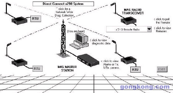 SCADA系列点对多点电台是遥控遥测工业自动化行业的顶级产品。它的电路采用DSP数字信号处理芯片,实现信道编码,前向纠错等功能。它采用CPFSK数字调制解调、Viterbi译码、均衡软判决等技术,软件处理增益达7dB。生产工艺全部表面贴片焊接。产品的稳定性、可靠性、抗干扰性、传输速率和传输距离远远超过模拟数传电台。电台的通讯范围在50公里以上。可以全双工、半双工或单工方式工作,收发同频或异频,EIA-232数据接口异步透明传输。电台支持话音通讯,通过复用器可以实现数话同传。 电台自带电压表、温度计、功率计、场强及干扰测试仪、误码统计、软件RTU等目前市场上其它品牌电台所不具备的功能。电台故障告警如温度过高过低(-40~+70℃)、供电电压超范围(10.5~16VDC)、异步串口数据格式不匹配等自动提示输出。 SCADA电台独有的系统网管软件InSite 6,实现空中远程设置系统内其它电台参数如串口格式、发射功率、工作频率等,也可以实现空中远程监测系统内其它电台状态如工作电压、工作温度、接收信号强度、信噪比、误码率、状态告警等。 SCADA系列电台具有多种机型,以满足不同系统要求,如中继台、全双工电台、双机热备电台等。 SCADA系列电台的主要性能技术指标: 1、工作频段:130~174MHz(1710型)/220~240MHz(2710型)/330~512MHz(4710型)/800~ 960MHz (9710型)/2.4~2.4835GHz(24810型)。 2、系统结构:支持点对点或点对多点传输,一级或多级中继组网。 3、工作方式:支持单工,半双工,全双工等方式,话音和数据兼容,提供对讲通话。 4、传输距离:50公里以上(开阔无阻挡)。 5、传输速率:19200bps。 6、物理接口:标准EIA-232,通信速率可从300到38400bps可调,完全透明传输, 无需RTS、CTS等流控信号,无需专用的通信软件。 7、调制方式:CPFSK。 8、信道间隔:12.5KHz/25KHz。 9、发射功率:100mW~5W连续可调/25W选配。 10、误码灵敏度:-111dBm以上(误码率BER≤10E-6)。 11、收发转换时间:3ms。 12、休眠电流:小于18mA。 13、频率稳定度:±1.5ppm。 14、状态和错误指示:LED状态指示,包括电源,载波,发射数据,接收数据和各种故障报警。 15、短路保护:有。 16、工作温度:-30℃~+60℃,工作时:-40℃~+70℃。 17、相对湿度:95%,40℃,无冷凝。 18、供电方式:电台工作时电压为10.5~16VDC,发射电流为1.5A,接收电流为125mA。 19、尺寸:5.08*14.29*18.4CM。 20、重量:约1公斤。 21、提供电台参数设置软件和网管软件。 网管(Network Management System)是指通过网络中的某一点,利用PC等终端,实现全网络系统中各通信设备的管理。 INSITE无线电系统网管软件是SCADA系列无线数据传输系统网管软件。它利用一台PC机,可以对一个点对多点系统的基站、远程站、中继站进行远程监测控制。即可以很方便地在办公室监测X710数字电台系统的状态,而不必去现场更改系统设置参数,也可以在网络系统中的任何一个站点,如主站、中继站、远程站,运用INSITE网管软件进行管理监控。  Insite网管功能界面图 INSITE软件有许多功能,在SCADA系列无线电系统中很容易实现。主要的功能包括: 1、内置RTU模拟器:可以用INSITE将网络中任何电台的RTU模拟器打开,检查无线链路的质量和电台的设置。可以用其它轮询软件对RTU模拟器轮询。 2、INSITE软件监测无线电系统运行状态,诊断通信中由电台,RTU,电源或传输路径引起的问题。用此系统经常可以检测到一些小问题,并作纠正,以避免影响到整个网络的运行。如果必须去现场检查,检查人员用网管系统提供的信息通常对所发生的故障有所判断,并做好相应的准备。此外,INSITE可以用于判断问题是在电台上或RTU上,并可以从中心控制室重置RTU,清除RTU故障。 3、远电台设置:许多电台的参数可以通过无线信道远程设置。例如:输出功率,设置类型,超时定时时延,接收发射频率,数据速率和格式等。根据电台类型不同,有不同的参数可以设置。 4、报警设置: A、图形显示报警数据,颜色标识。点击查看报警信息。可以让用户设置什么报警会引起外部触动开关启动。 B、非中断式的报警诊断轮询:连续的或定时的报警查询,不用中断用户的数据传输。 C、快速报警状态指针:如果电台对网管轮询没有响应。它能很快被发现。可用中断式诊断,迅速查询电台报警。 5、电台自动搜索:电台搜索功能可以自动生新的设备清单。在30分钟内,可以完成从0000到底9999的缺省地址码搜寻。搜寻结果可以加入新的设备清单,或加入现有的设备清单。 6、支技使用编码操作开关COS:用一台PC 机连接多个位于同一地点的基站电台。这一特性可以解决用远程电台做基站电台引起的诊断口地址问题,COS编码操作开关性能内置在X790基站电台内。如果多个基站不在同一地点,此方案无效。 7、提供休眠唤醒方式:在一些使用太阳电源的场合,电台常常设为休眠模式,只有通信时被唤醒。如果在网管时需要唤醒电台,采集数据,可以用“唤醒模式”,采集完数据后,又将电台变到休眠模式。 8、INSITE与企业网络联接,可以让系统主管,工程师可以在任何时候得到报警信息,甚至在远离网管终端时,报警信息可以通过电子邮件,短信息等方式传达给相关人员。 9、INSITE提供三个层次的企业网连接: ODBC把网管数据链接到本地或远端的数据库。 DDE动态数据交换服务器与本机上其它的应用程序或网络上其它应用程序分享数据。 TCP/IP远程接入服务器。 ODBC参数:如果网络中有SQL数据库服务器,允