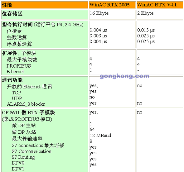 西门子自动化与驱动集团推出WinAC RTX 的新产品,从2005年9月15日起,WinAC RTX 2005开始接受订单。 WinAC RTX 2005是WinAC 的实时型产品,是WinAC RTX V4.1的升级版。它适用于对控制任务有确定性和实时要求的场合,如大量数据处理、物流系统、工艺功能(运动控制或视觉系统)、集成第三方设备(高速采集卡)等。 WinAC RTX 2005的新特点: * S7 程序处理性能极大提高,系统程序容量减少85%,程序运行速度提高6倍,最小程序循环周期为0.1ms以下 * 支持SIMATIC PC集成的 PROFIBUS 接口(CP 5611) 和以太网接口 * 用于嵌入式工控机平台SIMATIC Microbox PC 420 ,Microbox PC 420 有更加坚固的硬件配置。 - 硬盘由 CF 卡取代,CF 卡容量为 1 Gbyte. - 操作系统为 Windows XP embedded,Windows XP embedded 占用系统空间少,并提高了安全性、防病毒能力增强。 - 嵌入式低能耗微处理器,主频范围可选400 to 933 MHz,无风扇 - 集成ProfiBus、Ethernet、USB接口及串口 技术参数比较: