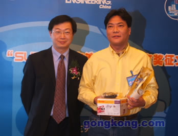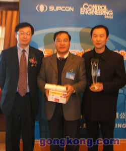 最受关注的一等奖由浙江中控技术有限公司副总裁裘峰先生揭晓,杭州电化集团有限公司的孔万力、胡志明、陈清华的题为《ECS-100控制系统在4万吨/年离子膜制碱引进装置上的应用》论文夺得本次征文大赛一等奖,裘峰先生为作者颁发奖品数码摄像机、水晶杯及奖状。获得一等奖的作者用激动的心情向嘉宾们介绍了浙大中控ECS-100控制系统在该厂4万吨/年离子膜制碱装置上的成功应用,打破了这一规模装置上高价位引进国外控制系统的惯例,获得了显著的经济效益和社会效益。